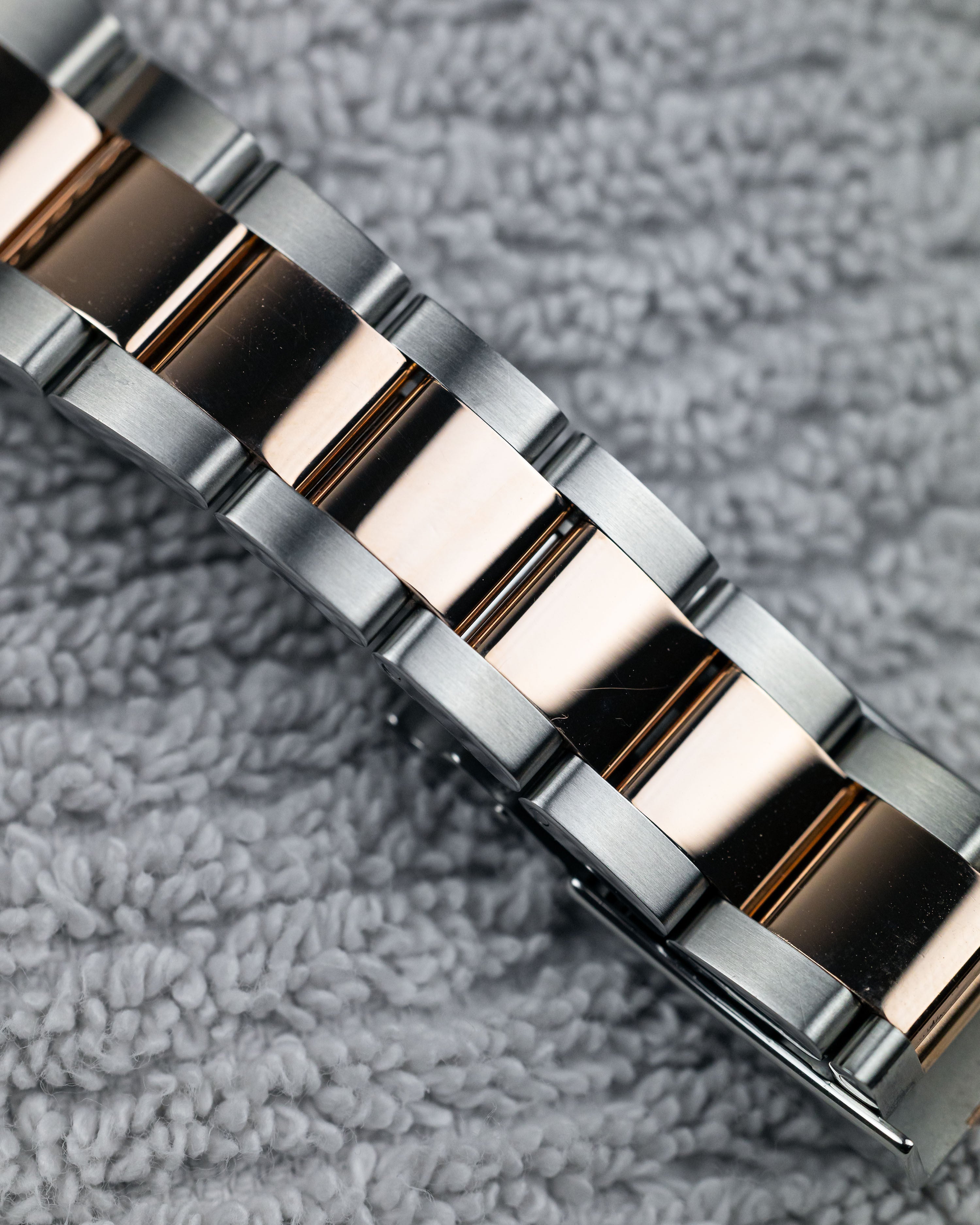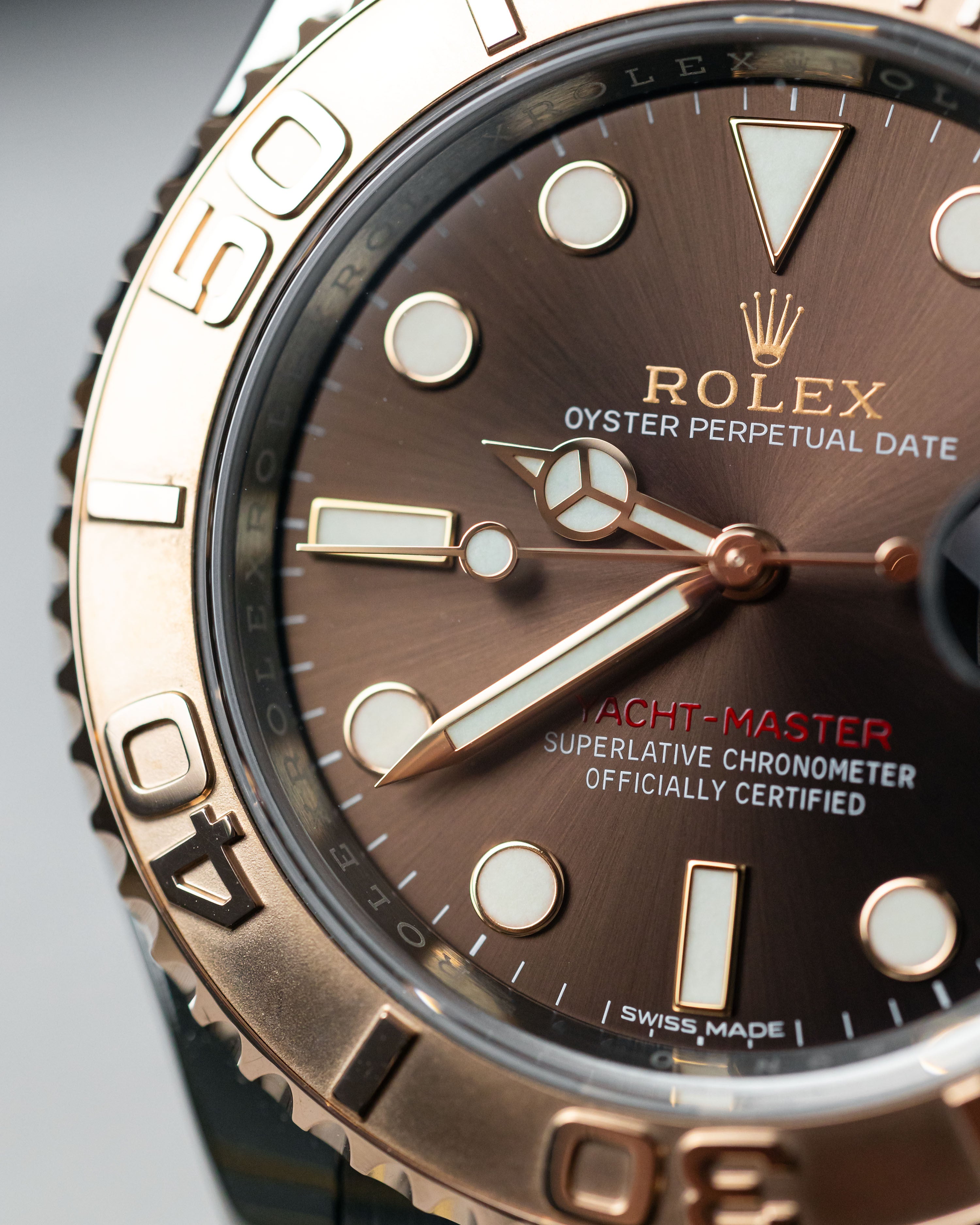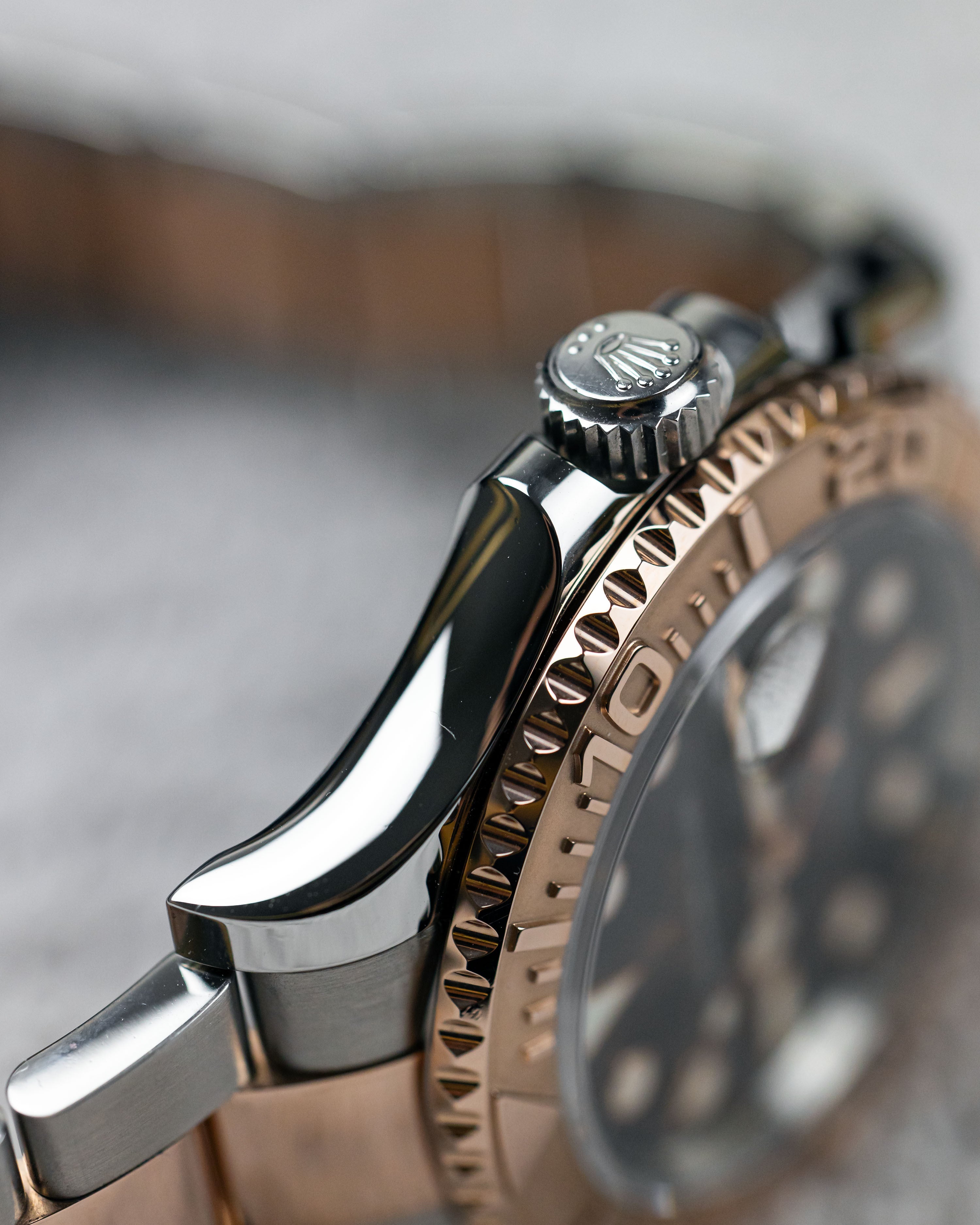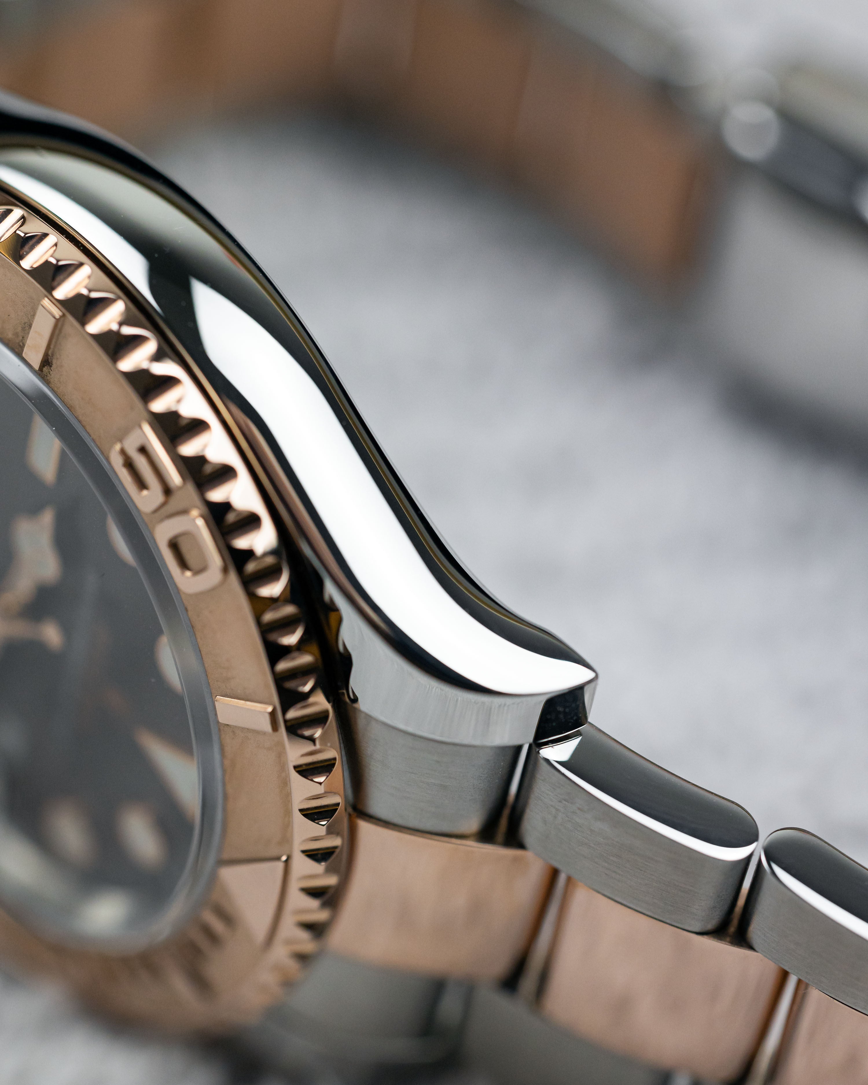 An elegant and sporty Rolex, the two-tone yacht master is available here with chocolate dial.